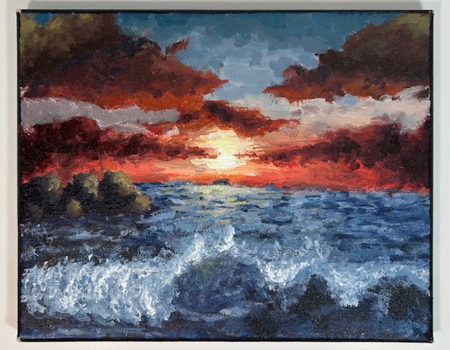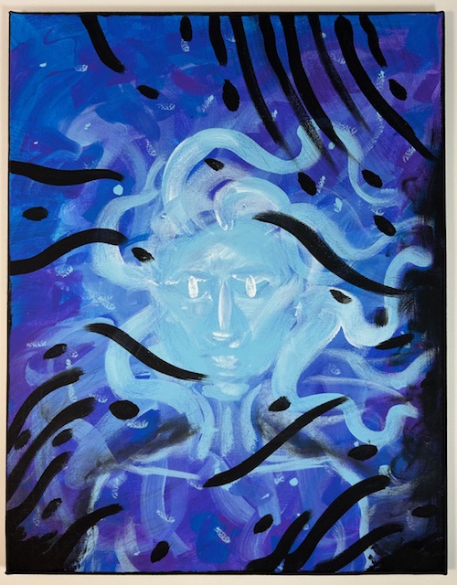 2D GALLERY Title: [Blue Medusa] Media: [Acrylic] Size: [28″ x 18″] Title: [Gaunt and Gray] Media: [Acrylic] Size: [28″ x 18″] Title: [Beach Sunset] Media: [Acrylic] Size: [18″ x 28″] Title: [Squiggle Sketch] Media: [Pastel] Size: [18″ x 28″]